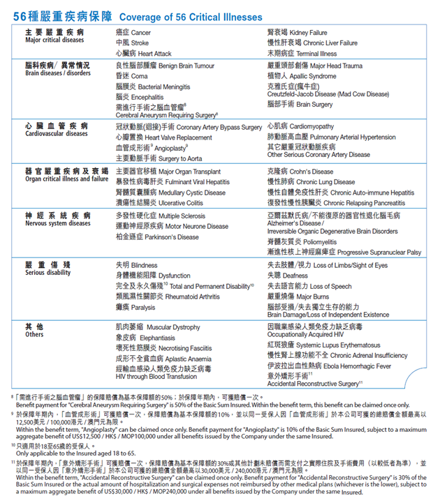 5 Only applicable when the Insured is first diagnosed with a "Severe Child Disease" before the policy anniversary on or following the Insured's 25th birthday. Within the benefit term, the "Severe Child Disease" benefit can be claimed once only. Benefit payment for "Severe Child Disease" is 30% of the Basic Sum Insured, subject to a maximum aggregate benefit of US$30,000 / HK$ / MOP240,000 under all benefits issued by the Company under the same Insured.