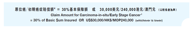 4 Within the benefit term, "Carcinoma-in-situ / Early Stage Cancer" can be claimed once only. Benefit payment for "Carcinoma-in-situ / Early Stage Cancer" is 30% of the Basic Sum Insured, subject to a maximum aggregate benefit of US$30,000 / HK$ / MOP240,000 under all benefits issued by the Company under the same Insured.