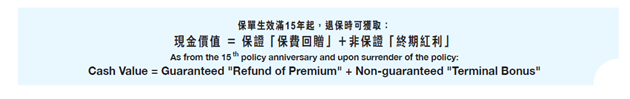 Effective from the 15th policy anniversary onwards, if you surrender the policy, the plan offers you a guaranteed "Refund of Premium" without deduction of any claims paid. In addition, a non-guaranteed "Terminal Bonus" will be offered at the same time so that you can enjoy a higher potential return.