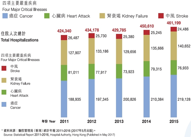 Younger Critical Illness Patients: Over the past five years, the number of hospitalizations due to critical illnesses, such as cancer, heart attack, kidney failure and stroke, reached over 2.2 million. Over 46% of the hospitalizations were due to the number-one killer disease - cancer*. In addition, critical illnesses are now striking patients at a younger age.