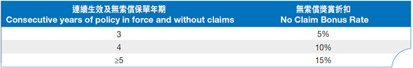 只要在續保時保單已於本公司從不間斷地連續生效達三個保單年或以上,以及期間並無就本計劃有任何索償紀錄,於支付續期保費時,即可獲享無索償保費折扣優惠,優惠金額會按上一保單年的「每年保費」的百分比計算,最高可達15%。