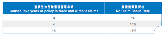 只要在續保時保單已於本公司從不間斷地連續生效達三個保單年或以上,以及期間並無就住院醫療多重保以及額外醫療保有任何索償紀錄,於支付續期保費時,兩者均可獲享無索償保費折扣優惠,優惠金額會按上一保單年的「每年保費」的百分比計算,最高可達15%。