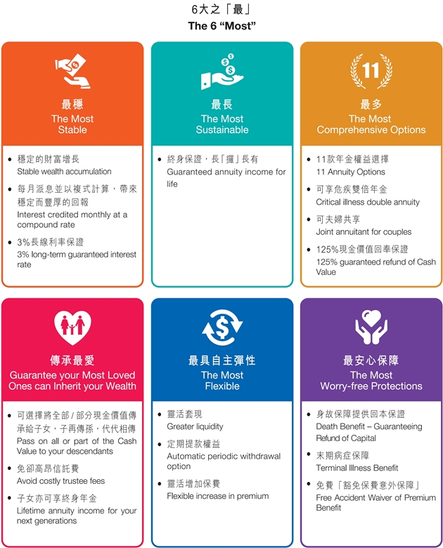 以上為計劃的一般資料,只供參考之用,並非保單的一部分。有關保障範圍、詳情及條款,請參閱保單文件。如有垂詢,歡迎與本公司之顧問、特許分銷商或保險經紀聯絡,或致電客戶服務熱線:香港 (852) 2533 5555/澳門 (853) 2832 2622。