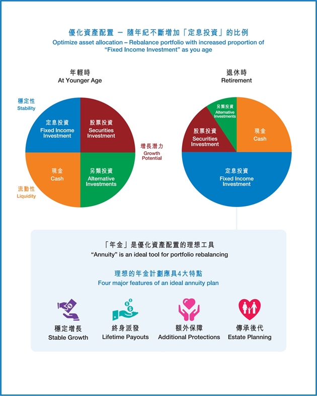 - 自主資產配置- 可選擇將全數現金價值轉為年金,亦可選擇只轉換部分,並將餘下的現金價值繼續於賬戶內滾存收息,傳承下一代;當然亦可將全部現金價值傳承下一代